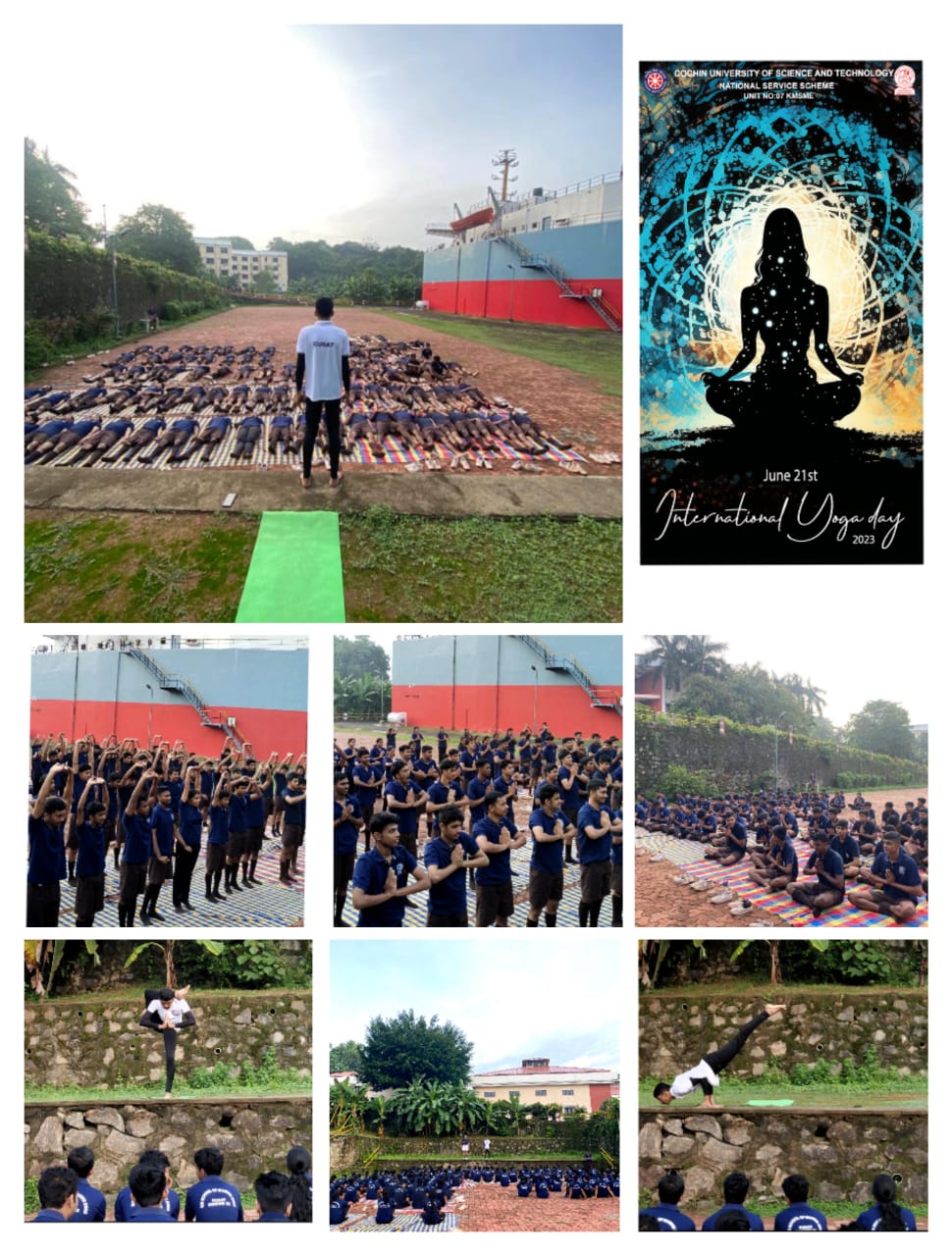 NSS unit of KM School of Marine Engineering, CUSAT celebrated International Yoga Day on Wednesday 21st June 2023 in ship in campus, KMSME. Yoga is similar to music. Cdt. Siva Jayakumar demonstrated surya namaskaram, pranayamas to the cadets and NSS volunteers of all batches in the morning pt session. Followed by artistic yoga performance by Siva made everyone so exciting.